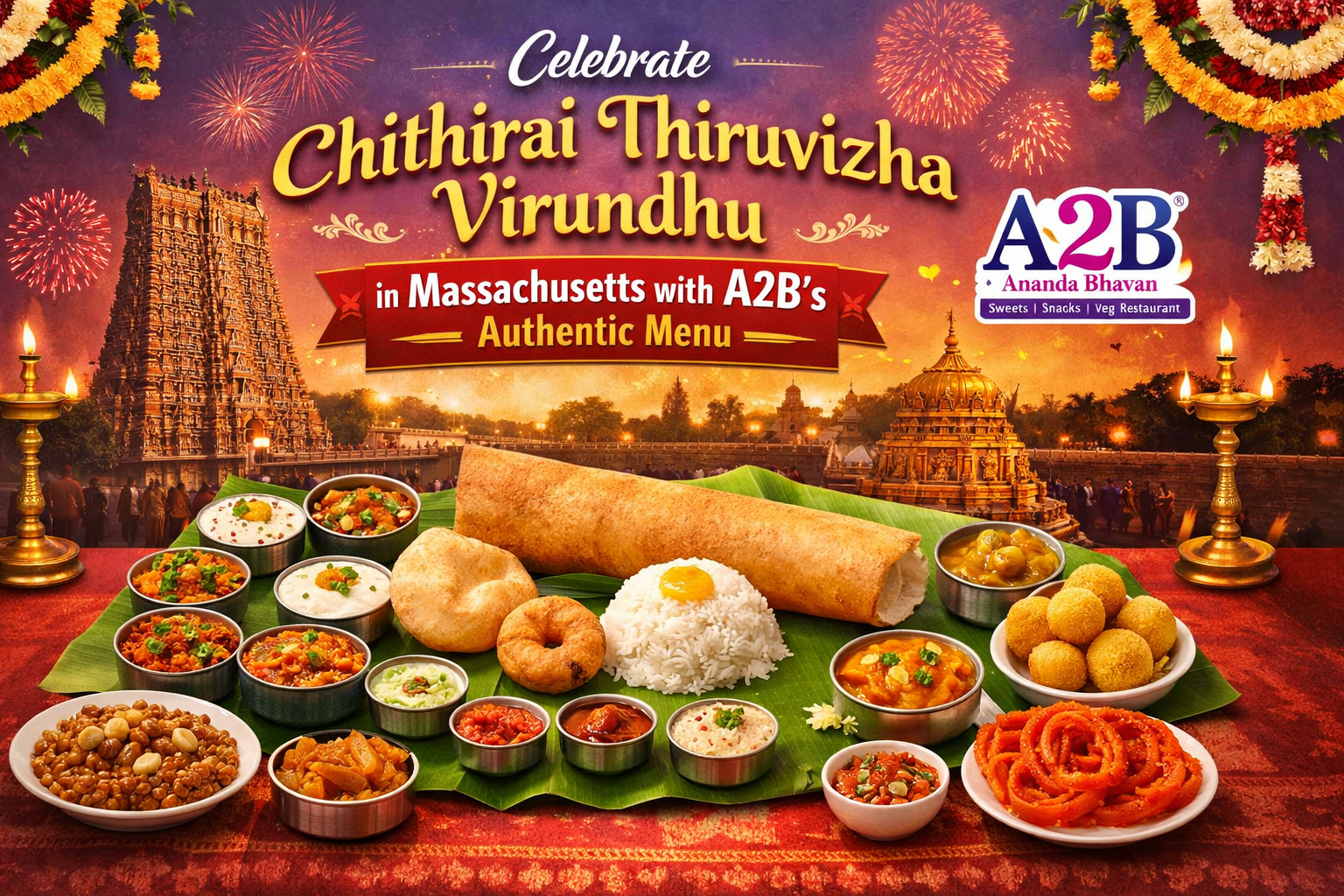 The Chithirai Thiruvizha Virundhu in Massachusetts at A2B stands out for its authentic preparation, traditional serving style on banana leaves, and a complete festive foods menu that mirrors Tamil New Year celebrations in India.